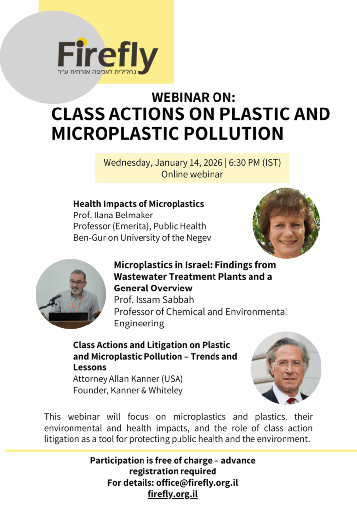This webinar will focus on microplastics, examined from both scientific and legal perspectives, and will draw on experience from class action litigation in the United States. The program will conclude with an open discussion aimed at identifying tools and directions for developing and advancing class actions in Israel related to microplastics, environmental protection, and public health.